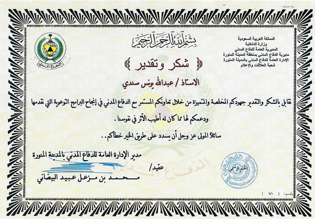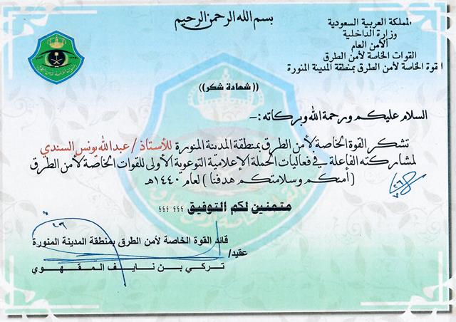 المدينة المنورة – أحمد وجيه كرمت القوات الخاصة لأمن الطرق بمنطقة المدينة المنورة سعادة الأستاذ عبدالله بن يونس السندي نائب مدير مشروع نظافة المدينة المنورة وذلك لمشاركته الفاعلة في الحملة الإعلامية التوعوية للقوات الخاصة لأمن الطرق ( أمنكم وسلامتكم هدفنا ) لعام 1440هـ والتي شملت تكثيف تواجد الضباط و الأفراد وكذلك الآليات التي تحمل شعار الحملة في نقاط الضبط الأمني وعلى مداخل المدينة المنورة لتوزع الهدايا التذكارية والمنشورات التوعوية على قائدي المركبات والمسافرين , وتهدف الحملة الى تعزيز العلاقة بين رجل أمن الطرق ومرتادي الطرق تعزيزاً للسلامة الأمنية و المرورية على الطرق الخارجية ولنشر الوعي بالنظام العام والسلامة. كما كُرم سعادته من قبل الإدارة العامة للدفاع المدني بالمدينة المنورة لدعمه ومشاركته المستمرة وتعاونه الدائم في إنجاح البرامج التوعوية والتي تقدمها الإدارة.