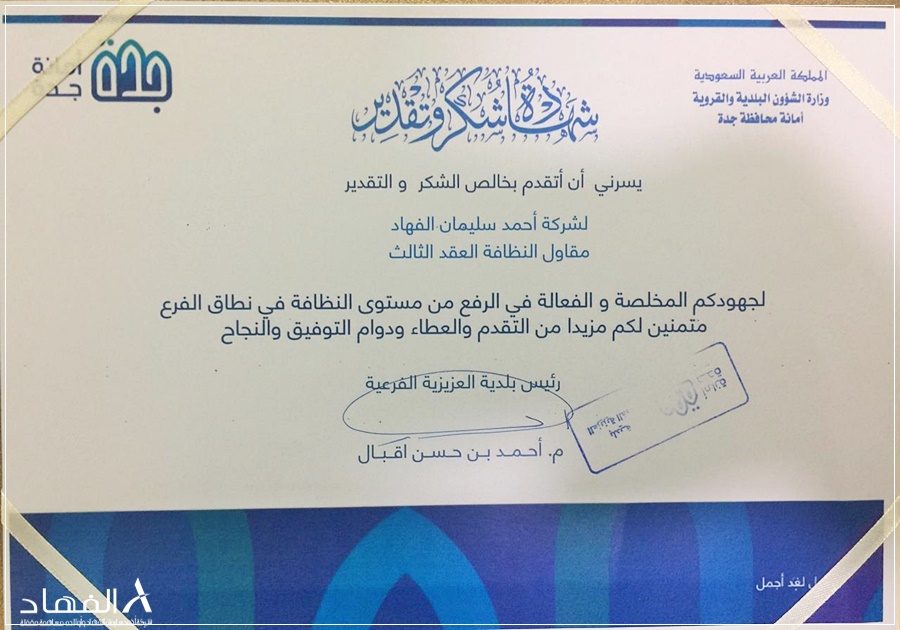 أحمد الشربيني – جدة كرم سعادة المهندس أحمد إقبال رئيس بلدية العزيزية القائمين بإدارة مشروع العقد الثالث بشركة احمد سليمان الفهاد واولادهـ على راسهم مدير المشروع مهندس /عواد مبارك المناصير و مدير العمليات أ/ علي العسيري وذلك على الجهود المبذولة و التعاون من فريق العمل في رفع مستوى الاداء مما انعكس على مستوى النظافة بنطاق بلدية العزيزية .